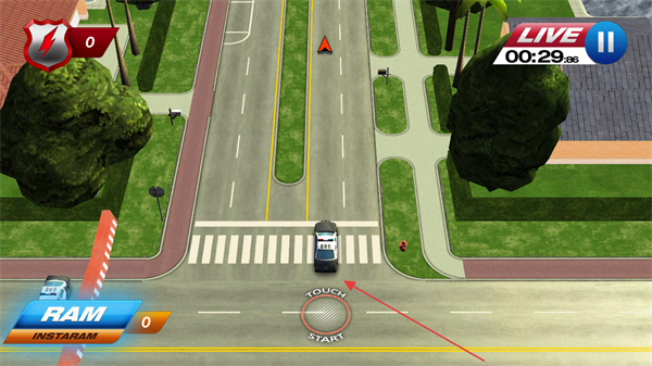 1、点击TOUCHSTART区域,启动警车,跟随箭头指引前进。