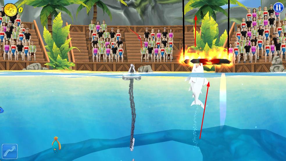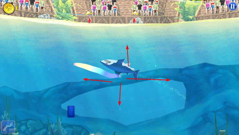 1、在水下场景中,操控鲨鱼四向移动,探索水域,寻找攻击目标,开启破坏进程。
