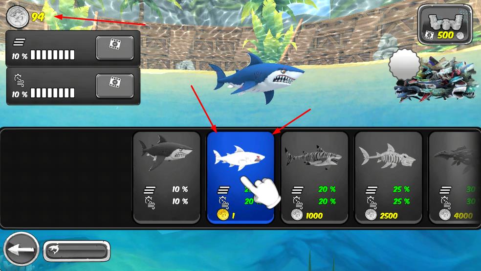 3、消耗金币解锁不同种类的鲨鱼,每种鲨鱼有不同的攻击属性,提升破坏能力。
