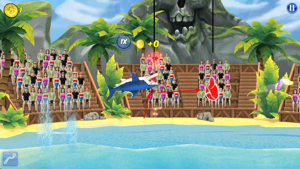 2、瞄准沙滩上的肉块发起攻击,可触发金币奖励,积累金币资源。