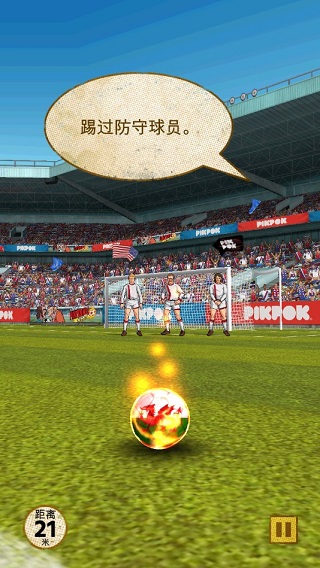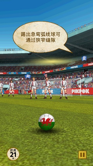 游戏的操作和规则都很简单,我们可以用手指划出直线或者弧线控制足球的方向,虽然说是任意球,但其实和真实比赛中还是有所不同的,有些时候甚至是没有人墙或者是门将。但不管怎么样,我们的目标就是将球踢进球门中,然后途中不能碰到门将或者人墙中的队员。