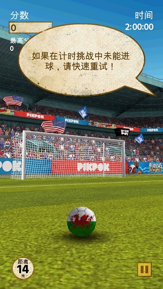 接着是“街机模式”,这个模式下玩家刚开始只有一条命,如果打进“死角任意球”可以加1条命,最多4条命,得分方面只要进球都得1分,不进球会失去一条命。接着是“靶心”模式,在这个模式下我们有1分钟时间,只是这回的目标不是球门,而是一个个的靶子,打中靶子的中心可获得3秒钟的加时、普通击中为1秒钟、如果一个球可以打中多个靶子,也有时间和分数的加成哦。最后的“计时挑战”模式,这个模式有两分钟的时间,无论进的是普通的球还是死角球都是得1分,但普通球加1秒钟、死角球加三秒钟,跟“SkillShot”模式有些类似。
